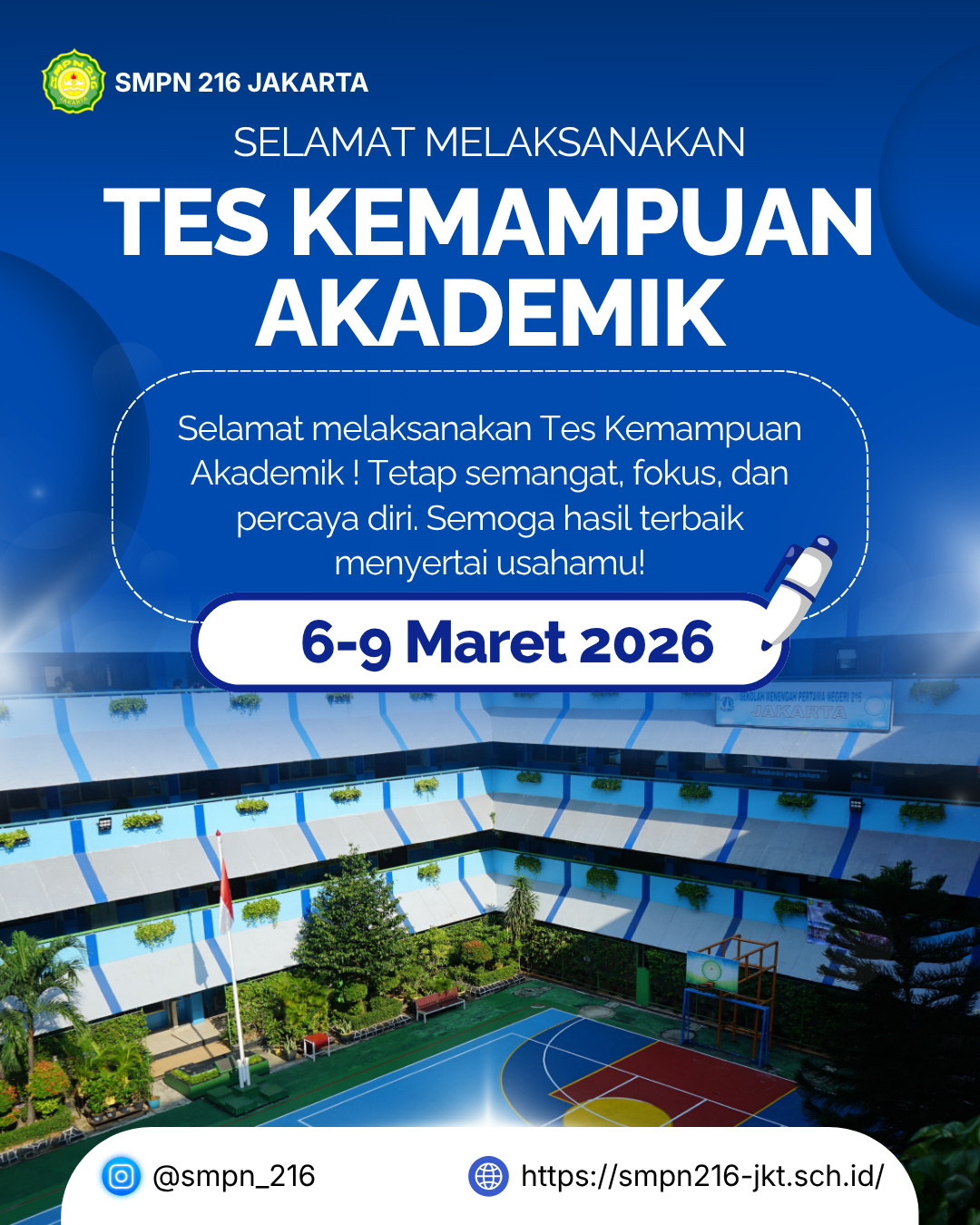 Akhirnya, keluarga besar SMPN 216 Jakarta mengucapkan:Selamat dan sukses kepada seluruh siswa kelas IX dalam melaksanakan Tes Kompetensi Akademik (TKA) Tahun 2026.