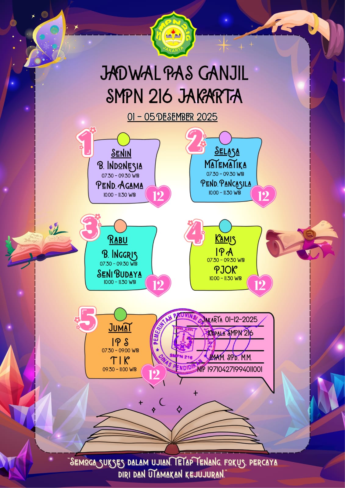 Pada Senin, 1 Desember 2025, SMPN 216 Jakarta melaksanakan kegiatan Pembukaan Penilaian Akhir Semester (PAS) Ganjil tahun pelajaran 2025/2026. Seluruh peserta didik berkumpul di lapangan sekolah dengan tertib sesuai kelas masing-masing.