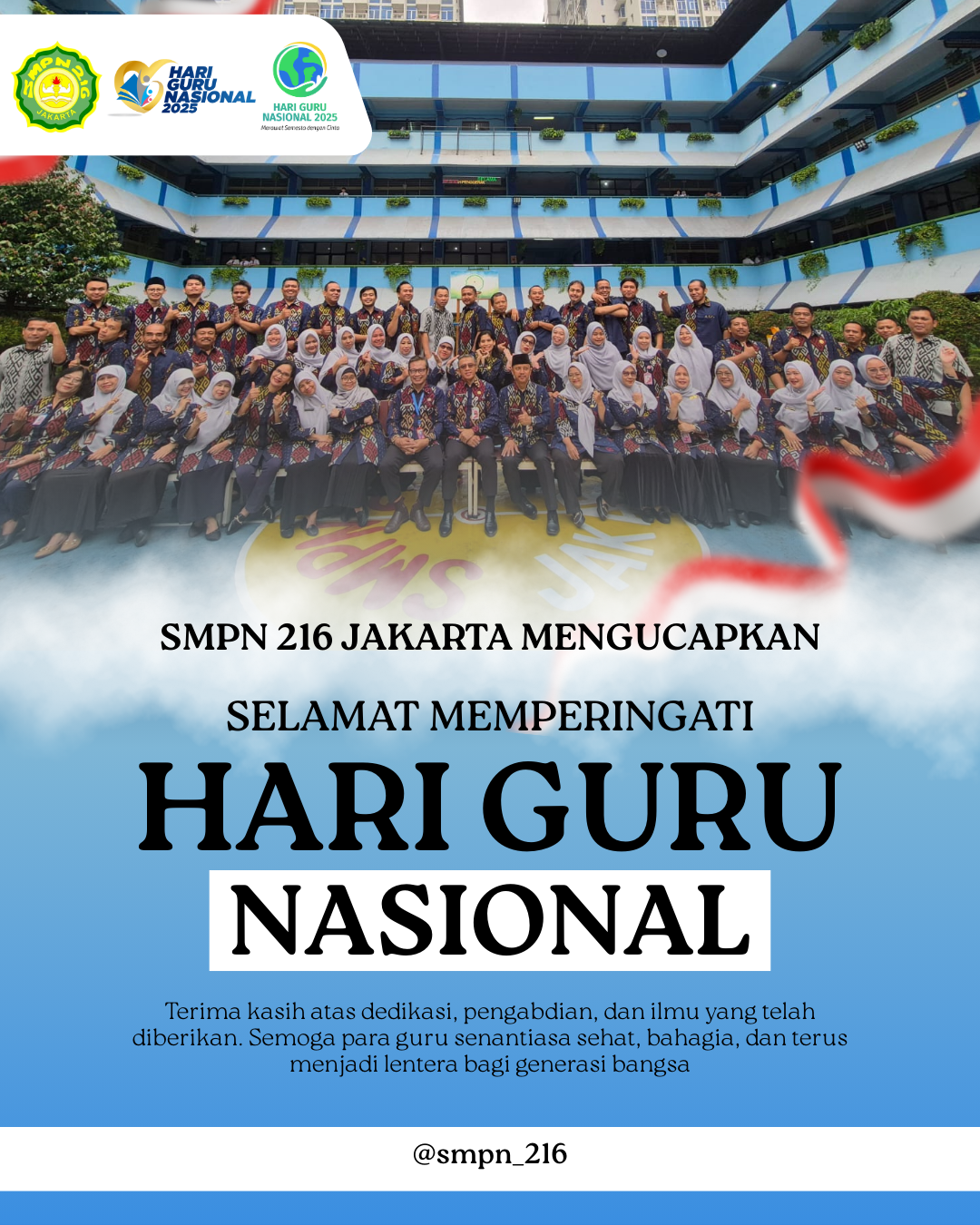 SMPN 216 Jakarta melaksanakan Upacara Peringatan Hari Guru Nasional Tahun 2025 dengan mengusung tema “Guru Kuat, Indonesia Hebat”. Kegiatan ini diikuti oleh seluruh warga sekolah, mulai dari peserta didik, dewan guru, hingga tenaga kependidikan, dan berlangsung dengan penuh khidmat serta sarat makna.